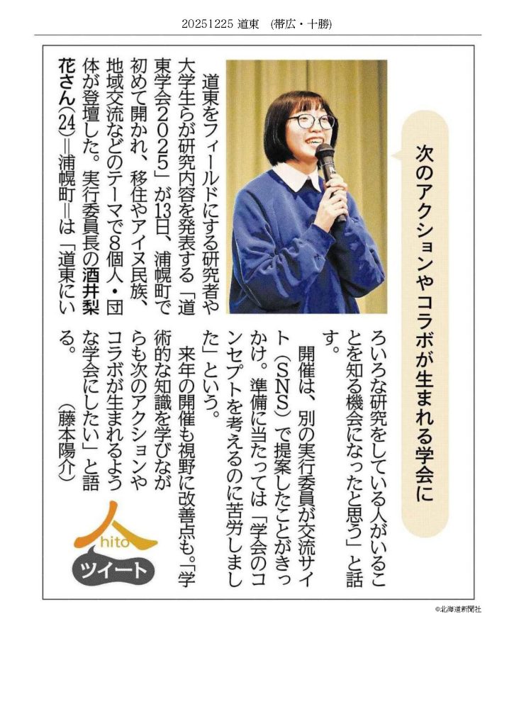 なお、実行委員長の酒井梨花さんは、2025年12月25日の北海道新聞十勝面「ひと」欄で紹介されています。