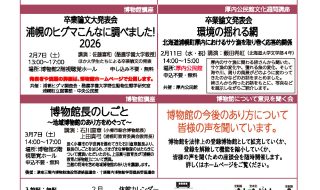 日時:2026年2月7日(土)13:00〜17:00 ※卒業論文発表会のあと、基調報告となります。 場所:浦幌町立博物館2階視聴覚ホール 申し込み不要・参加無料 今年も浦幌ヒグマ調査会との共催…詳細を見る -