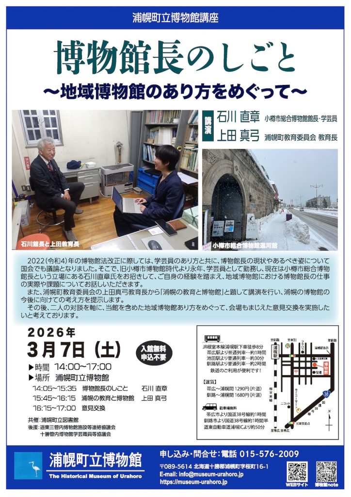 また、浦幌町教育委員会の上田真弓教育長から「浦幌の教育と博物館」と題して講演を行い、本町の博物館の今後に向けての考え方を示します。